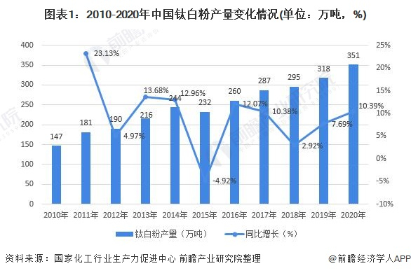 在我国钛白粉产量方面,据国家化工行业生产力促进中心钛白分中心和钛白粉产业技术创新战略联盟秘书处统计,2020年全国所有42家全流程型钛白粉生产企业的各类钛白粉及相关产品综合产量为351.2万吨,比上年增加33万吨,增幅为10.39%。