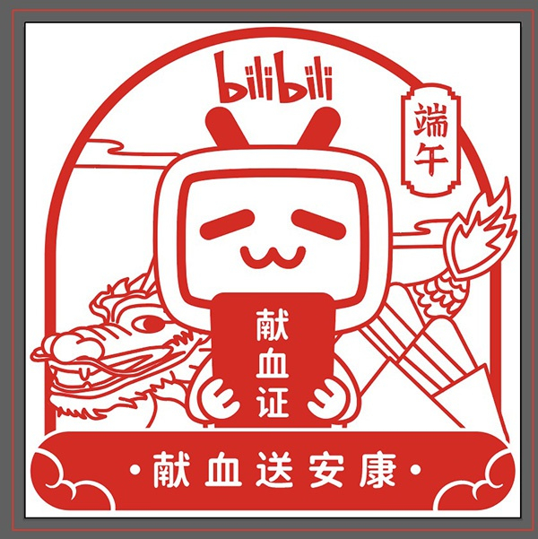 哔哩哔哩品牌形象小电视手捧献血证,与背后的中国龙相得益彰,边上的“端午”二字表明,这是一枚节日限定印章。