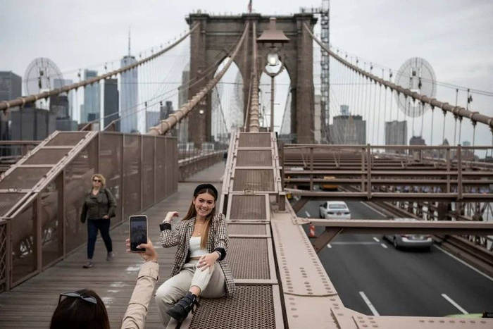 一位来自墨西哥的游客在布鲁克林大桥上拍照。纽约市的游客人数从2019年的6600万锐减至去年的2200万。©Kirsten Luce/《纽约时报》