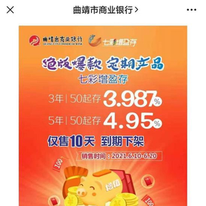 曲靖市商业银行微信公众号显示,这张海报发布于6月11日,主要为推广该行贷款产品以及存款产品。海报显示,该行一款名为“七彩增盈存”的存款产品,3年期年利率为3.987%,5年期年利率为4.95%,均为50元起存,销售时间为2021年6月10日至6月20日,并且仅销售10天,到期下架。
