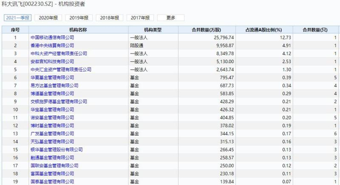 此外,科大讯飞股东中基金扎堆,截至一季度末,基金持股超6374万股,持股比例为3.15%。
