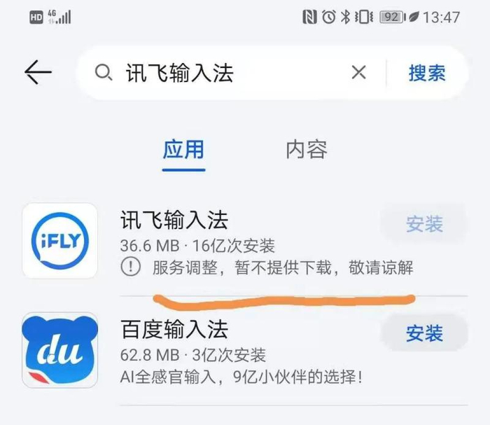 记者发现,在苹果、华为、小米等应用商店搜索讯飞输入法,均无结果显示或无法下载。在华为应用商店,讯飞输入法下方提示暂不提供下载,原因是“服务调整”。