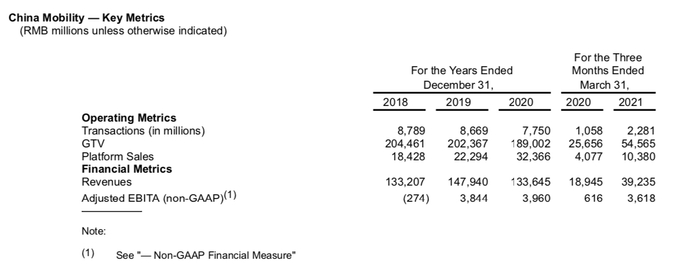 不过,滴滴在中国出行市场上实现了盈利:2019年实现调整的息税前利润38.4亿元人民币,2020年39.6亿元人民币,2021年一季度36.2亿元人民币。
