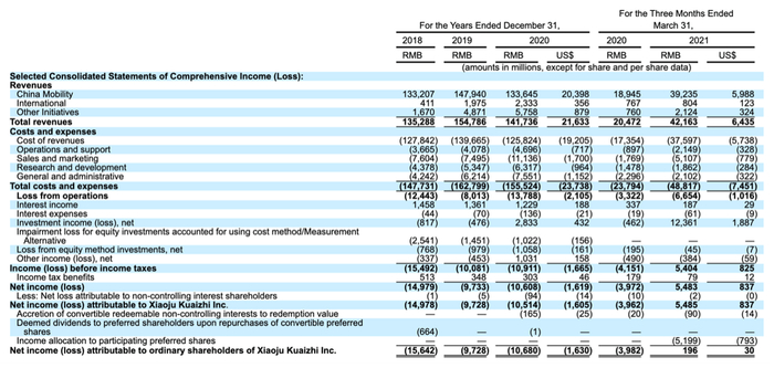 在招股书中,滴滴详细列出了2020年滴滴在中国出行市场上的财务状况。