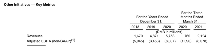 到了今年,亏损更是进一步扩大。今年一季度,仅单季度的新业务亏损就达到了80.8亿元。2018年到2021年一季度,滴滴在新业务的亏损已经合计超过260亿元。