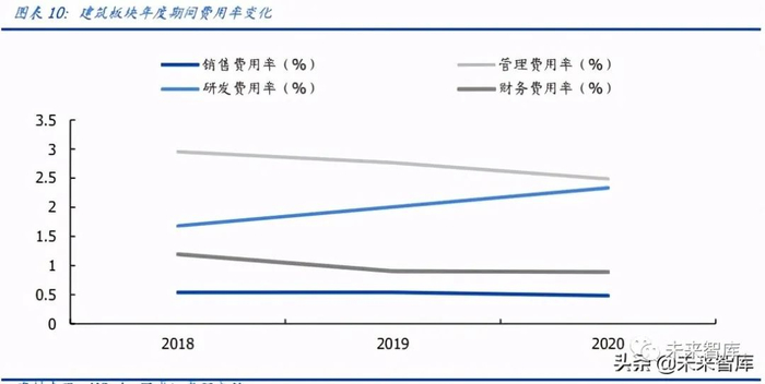 疫情下持续推动经营提质增效,管理费用率明显下降。2020 年上市建筑企业期间费用率 为 6.19% , 同 比 基 本 持 平 , 其 中 销 售 / 管 理 / 研 发 / 财务费用率分别变化 -0.06/-0.28/+0.33/-0.01 个 pct,管理费用率下降预计主要系建筑企业持续提升管理、 优化效率所致;研发费用率提升预计主要系建筑企业加快工业化、信息化、绿色化转型, 叠加税收优惠政策引导所致。2020Q1 期间费用率 5.58%,同比下降 0.91 个 pct,主要 系去年 Q1 疫情下各费用率较为刚性,导致基数较高,今年 Q1 逐渐恢复正常经营状态所 致。