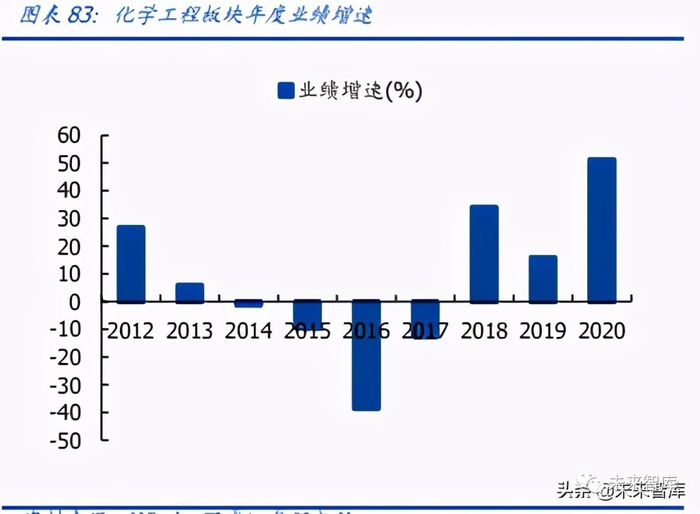 整体景气有望向上,20 年资产减值计提减少助力业绩持续修复。2020 年化学工程板块 营收和业绩分别增长 6%/51%,较 2019 年同比变动-21/+35 个 pct。业绩增速较高,主 要因百利科技、中国化学等公司计提减值明显减少。2020Q1-4 化学工程板块营收分别 同比变动-25%/-5%/+6%/+6%;业绩分别同比变动-26%/-12%/+11%/+51%,板块经 营自三季度起显著恢复,带动全年营收和业绩在疫情环境下仍实现正增长。2021Q1 板 块营收与业绩分别增长 90%/78%,两年复合增速 20%/15%,主要因去年疫情造成基数 较低,随着全球经济恢复,化工品价格及国际油价持续上涨,相关业主资本开支有望加 快,顺周期化学工程板块明显受益。