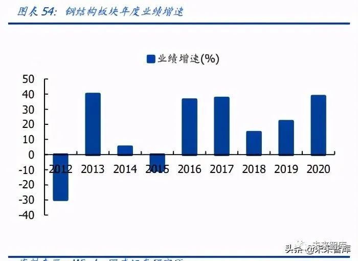 钢结构龙头企业营收业绩表现较为突出。2020 年钢结构板块收入增速排名前三的为鸿路 钢构、杭萧钢构、海波重科;业绩增速排名前三的分别为海波重科、精工钢构、杭萧钢 构。其中: