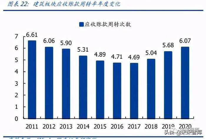 存货与应收账款周转能力整体呈现触底回升。过去多年来存货、应收账款周转率持续下 降,但 2017 年趋势变缓,近几年存货周转率在底部震荡,应收账款周转率持续提升, 2020 年建筑板块存货周转/应收账款周转次数为 2.23/6.07 次,同比变动-0.02/0.39 次, 应收账款周转率上升主要系建筑企业持续加强审计收款所致。2021Q1 在疫情环境下存 货周转次数和应收账款周转次数保持提升趋势,同比分别增加 0.13 和 0.41 次。