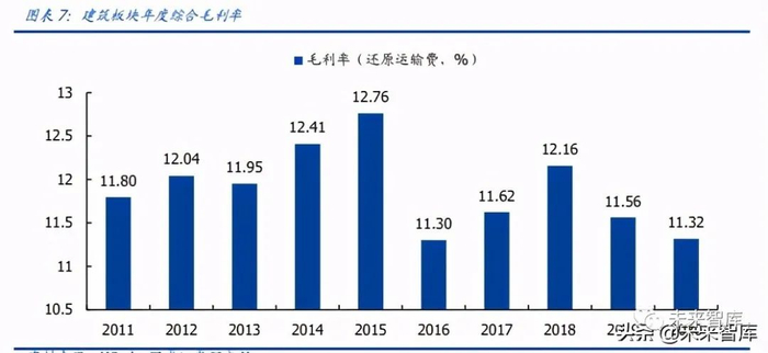 2020 年部分建筑企业启用新会计准则,将“运输费”从“销售费用”中放入了“营业成 本”,导致毛利率有所下降。经我们统计,主要建筑央企都还未在财报中正式变更该会计 准则,变更了改准则的主要包括中材国际、鸿路钢构、宁波建工、美晨生态、城地香江 等 11 个建筑公司。大部分建筑公司并未详细披露 2020 年“运输费”的实际金额,因此 我们可以将未披露 2020 年实际运输费的这些公司用 2019 年的数据近似替代,以此推算 2020 年新会计准则下的行业整体毛利率,从结果来看,该会计准则变更对板块整体毛利 率影响非常微小。