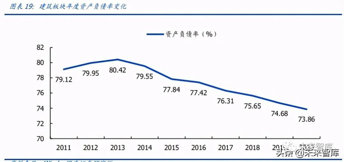上市建筑企业整体负债率自 2014 年起开始下行。2020 年整体资产负债率为 73.86%, 较 2019 年下降 0.8 个 pct,加速下行。2021Q1 整体负债率为 74.05%,同比下降 0.63 个pct。2020年是央企降杠杆收官之年,年底八大建筑央企资产负债率已达到国资委75% 目标范围内,2021 年以来国资委对央企负债率考核态度从降杠杆转变为稳杠杆,预计后 续央企资产负债率有望保持平稳。