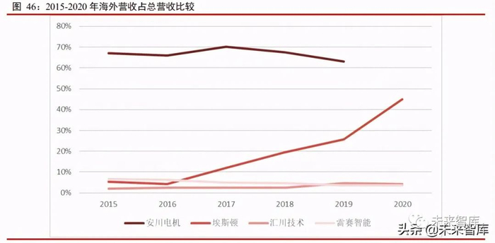 安川电机相比国内企业,全球市场份额占据较大,与发那科、ABB、KUKA 稳占全 球前四地位。安川电机 2015-2019 年海外收入占比维持在 63%以上,海外销售地区有美 洲、中东、亚洲等;出口中国营收金额为海外营收最高约 51.12 亿元,占海外营收的 30.86%。埃斯顿 2020 年海外营收占比大幅提升,2019-2020 年海外营收分别为 4.06 亿元、11.27 亿元,占总营收 25.66%、44.89%,考虑主要系海外资源整合优化,德国 Cloos 海外资源和渠道助力导致。汇川技术和雷赛智能海外营收占比较平稳。汇川技术 2019-2020 海外 营收分别为 3.43 亿元、4.95 亿元,占总营收 4.64%、4.3%;雷赛智能 2019-2020 年海外 营收分别为 0.24 亿元、0.33 亿元,占总营收 3.64%、3.53%。