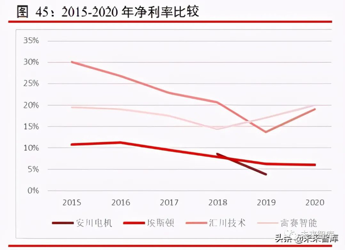安川电机 2019 年毛利率为 30.39%,同比下降 2.65 个百分点;净利率为 3.83%,同 比下降 4.74 个百分点;埃斯顿 2020 年毛利率为 36.01%,同比几乎持平,上升 0.02 个百 分点;净利率为 6.04%,同比小幅下降 0.16 个百分点;汇川技术 2015-2019 年毛利率和 净利率持续下降至最低点,2019 年分别为 37.65%、13.67%,2020 年盈利指标回升,分 别为 38.96%、18.95%,主要系降本增效措施及产品销售结构变化策略效果良好。雷赛 智能 2020 年毛利率为 42.34%,同比上升 0.28 个百分点;净利率为 19.88%,同比上升 2.8 个百分点;毛利率和净利率自 2019 年开始回升,净利率创新高。