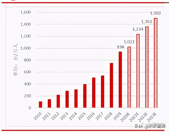 2019 年国内非汽车行业自动化生产仍在起步阶段, 仅为汽车行业 2010 年的水平,上升空间巨大。我们认为随着工业机器人技术愈发成熟, 作业更加精细化,工业机器人在食品、饮料等长尾行业中的包装、挑拣、分配等工作的 使用率将逐渐提高。预测 2020-2023 年中国非汽车行业工业机器人密度以 35%增速增长, 分别达到 128 台/万人、173 台/万人、234 台/万人、316 台/万人。