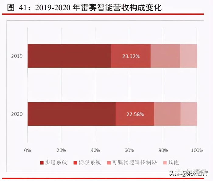 安川电机 2019 年主营业务分为动态控制、机器人、工程系统,分别占总营收的比 例为 43.29%、37.03%、14.14%。埃斯顿 2020 年核心零部件和工业机器人业务占比分别 为 33%和 66%,相比 2019 年营收构成变化较大,主要系工业机器人业务坚持“通用+ 细分”战略和收购合并德国 Cloos 的技术、品牌效应等因素助力增加通用机器人和焊接 机器人的销量扩大营收占比。汇川技术 2020 年工业自动化业务占比 81.24%,较 2019 年上升 1.17 个百分点,其中运动控制类产品占比 18.98%,较 2019 年上升 3.46 个百分点。雷赛智能伺服系统类和控制技术类业务占比分别为 22.58%、15.65%,较 2019 年增长 -0.73%、1.66%;