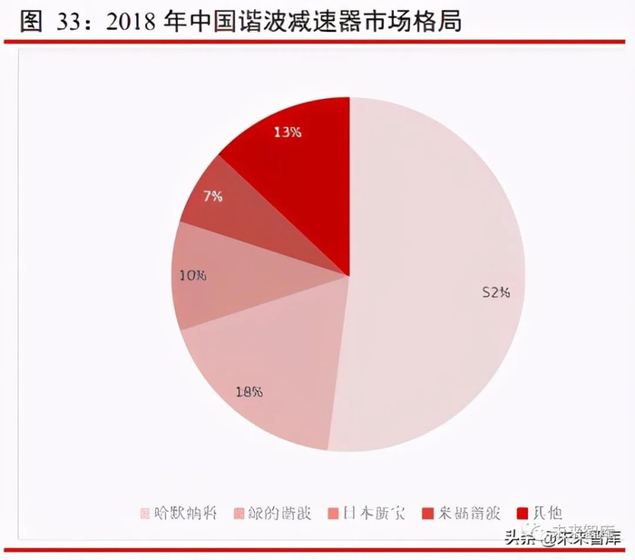 减速器对技术要求极高,核心技术工艺主要在齿面热处理、加工精度、成组技术、 装配精度等方面。在核心工艺上的丝毫差距会影响减速器的精度、刚度、损耗速度和寿 命。2018 年日系企业纳博特斯克和哈默纳科占据全球减速器市场份额的 75%,基本垄断 全球市场。国内在核心技术方面相比国外相对较弱,还需有经验累积的过程。根据 GGII 数据显示,目前国内机器人减速器 70%以上份额仍被外资企业垄断,国产减速器份额占 比不足 30%。减速器市场格局变化不大。四大家族仅减速器均无自主研发,使用的减速 器均为外购产品。RV 减速器和谐波减速器领域分别由纳博特斯克、哈默纳科垄断。