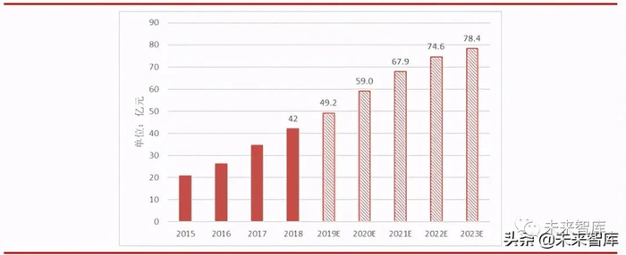 控制器下游应用广泛,前五大行业分别是工作机械(11.73%)、包装(11%)、纺 织(9.59%)、工业机器人(9.11%)、半导体(7.43%),总共占比 48.86%。控制器在 中国的市场规模从 2015 年 20.7 亿元增至 2018 年 42 亿元,年复合增速 26.6%。假设每 台工业机器人配套一套控制器系统需3.5万元,根据中国工业机器人销量预测,2019-2023 年控制系统规模分别为 49.2 亿元、59 亿元、67.9 亿元、74.6 亿元、78.4 亿元。