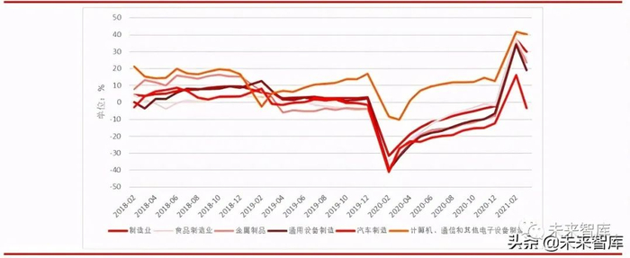 2018 年末开始制造业面临巨大下行压力,固定资产投资增速持续下滑,2020 年 2 月受疫情影响触底,制造业固定资产投资完成额累计增速-31.5%。疫情后固定资产投资 完成额累计增速持续上升至 2021 年 2 月,2021 年 3 月整个制造业固定资产投资完成额 累计增速较 2 月呈下降趋势,主要原因系 2020 年 2 月基数较低导致。2021 年 3 月制造 业固定资产投资完成额累计增速为 29.8%,计算机、通信和其他电子设备制造业固定资 产投资完成额累计增速 40.4%,高增速拉动行业平均水平。2021 年 2 月汽车制造业固定 资产投资完成额累计增速在经历约 3 年持续低增长和负增长后,首次出现高于 10%的正 增长,3 月累计增速回落至-3.3%;食品制造业、金属制品业、通用设备固定资产投资完 成额累计增速分别为 25.6%、23.6%、19%。