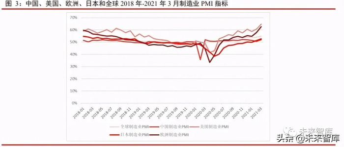 2021 年 3 月美国、欧洲、日本、全球制造业 PMI 均高于中国,分别为 64.7%、62.5%、 52.7%、55%。数据显示美国、欧洲、日本、全球制造业景气度站在荣枯线上,由此反 应各国和全球经济均在持续复苏。