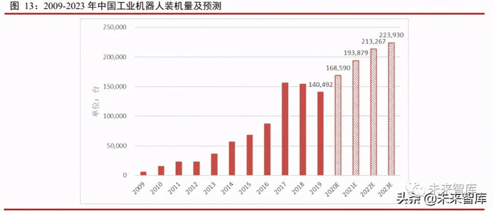 2019 年工业机器人下游应用行业需求量有明显下降,尤其汽车和 3C 行业相比 2018 年购买量共下降约 4 万台。我们认为 2020 年上半年疫情后工业机器人需求不降反升, 随着全球经济的进一步复苏,我们预测 2020-2023 年工业机器人装机量分别为 16.85 万 台、19.38 万台、21.32 万台、22.39 万台。