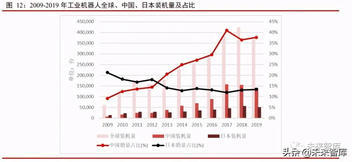 虽然日本进入老龄社会已久,但日本仍保持制造业大国地位,2018 年工业机器人出 口量是中国的 2 倍。这有赖于日本专注于高新技术发展,制造业自动化覆盖率高,工业 机器人密度高达 364 台/万人。2019 年中国工业机器人出口量激增 76%至 10.55 万台,相 较日本出口量仅差 318 台。近两年中国工业机器人出口量有望赶超日本成为出口量第一。