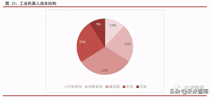 我国工业机器人行业在经历数十年发展后形成完整的行业产业链。上游零部件作为 原材料对于工业机器人极为重要,三大核心零部件控制系统、伺服系统、减速器分别占 总成本的 12%、22%、32%,合计成本占比近 7 成;目前国内大部分零部件较依赖国外 知名厂商。中游为机器人本体,下游是集成系统。目前工业机器人的应用市场包括汽车、 3C、食品、饮料等行业。