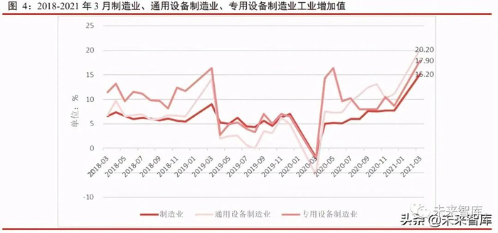 另外,2020 年初制造业工业增加值指标触底至-1.8%,通用设备制造业、专用设备制造 业工业增加值指标分别为-5.4%、-2.2%;随后呈上升趋势至 2021 年 3 月,制造业工业增 加值为 15.2%,通用设备及专用设备制造业工业增加值高于行业平均水平,分别为 20.2%、 17.9%,制造行业复苏态势明显。