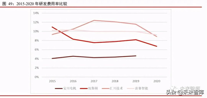 安川电机 2015-2019 年研发费用分别为 8.35 亿元、10.9 亿元、10.3 亿元、11.57 亿 元、12.14 亿元;2019 年国内 3 家企业中研发费用最大的汇川技术仅为安川电机的 2/3。安川电机持续投入大量资金用以技术研发,令其技术领先于其他企业,站在时代尖端。