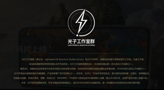 公开资料显示,光子工作室群是腾讯IEG (互动娱乐事业群)四大游戏工作室群之一。光子工作室群(英文名:Lightspeed & Quantum Studios Group)成立于2008年,由腾讯游戏旗下原有的量子工作室、光速工作室、QQ游戏棋牌 等优秀研发团队合并升级而来。