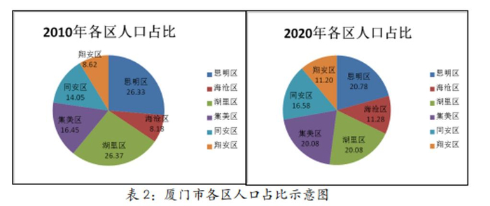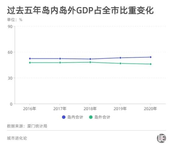 根据厦门市统计局公开数据,2010年,岛内思明区、湖里区2个区GDP总量1122.26亿元,占全市54.6%,岛外海沧区、集美区、同安区、翔安区4个区GDP总量931.47亿元,占全市45.4%。