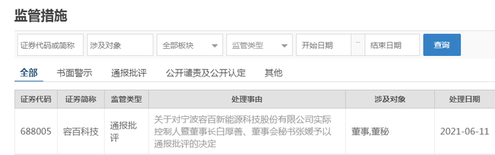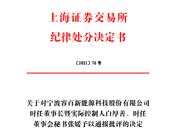 6月11日晚,上交所公布科创板今年首份纪律处分决定书,宣布对容百科技实际控制人暨董事长白厚善、董事会秘书张媛予以通报批评。