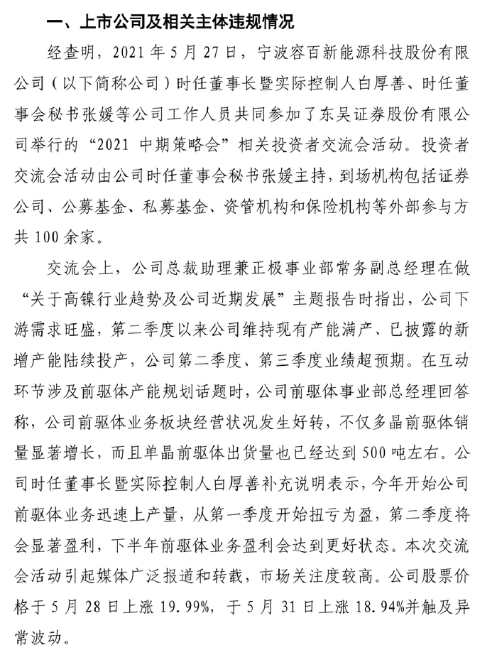对此,上交所未予认可。上交所认为,白厚善在交流活动中直接透露“前驱体今年开始迅速上产量,从一季度开始扭亏为盈,这个季度将会显著的盈利,下半年前驱体盈利会达到更好的状态”。而前驱体业务是公司两大核心业务之一,受到投资者高度关注。