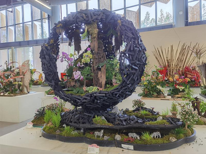 目前,百花馆保留了第一档展期30多盆精品花卉盆栽作品,所有作品都是由盆栽植物分会会员单位在5天之内现场创作完成。比如,其中一幅作品《保护地球》,作者利用木炭、枯木等打造了一个微缩版地球,中间以花卉植物、小动物等作为点缀,呼吁人类合理利用资源、保护生态平衡。