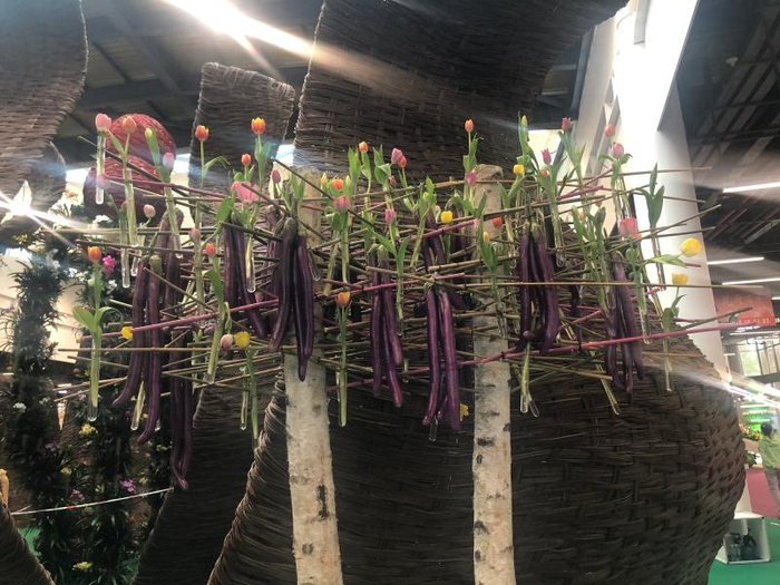 花博园区每天都有新面貌。“比如,花艺馆巨型花雕作品目前的主题为‘情系端午,花食飘香’,布展方选择接近野花野草的自然风格花材,结合端午传统的食材进行布展,勾起人们埋藏心底的乡愁。”花博会指挥部展览服务中心副主任、花艺馆馆长吴军告诉记者,此前参展方连夜对花卉进行了更换,生活中常见的蔬菜和水果,如茄子、土豆、西蓝花、洋葱、枇杷等,都被园艺“大咖”们进行了组合式串联,比如郁金香与茄子组合成垂帘,一片片粽子叶悬挂在花卉下方,构成返璞归真的花艺作品。