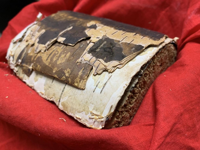 马继民用一块红布包着“传家宝”桦树皮,放在一个小木盒中