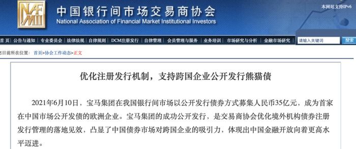 6月11日,中国银行间市场交易商协会官网信息显示,宝马集团于本月10日在我国银行间市场以公开发行债券方式募集人民币35亿元,成为首家在中国市场公开发债的欧洲企业。