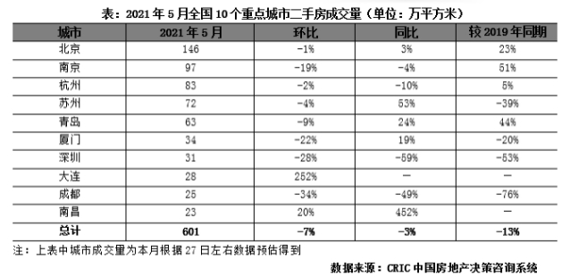 据克而瑞研究分析,5月10个重点城市共计成交601万平方米,环比回落7%。