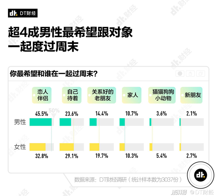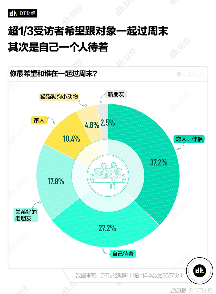 在被问到最希望和谁在一起过周末时,37.2%的人希望和‘恋人、伴侣’一起,27.2%的人则认为‘自己待着’更舒服。