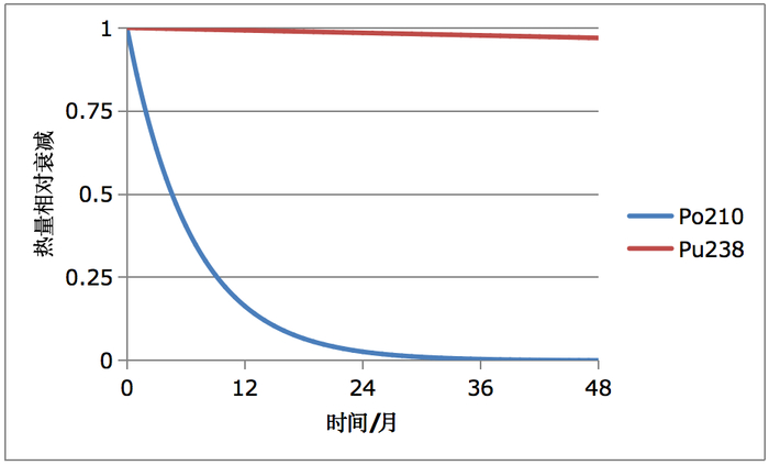 从下图中可以看到,钋210热源从生产出来,到10个月后释放的热量已经衰减到初值22%,而钚238热源在48个月后,只是衰减到最初的97%,变化很小。考虑到热源生产出来到发射,再到在月面工作,钚238热源显然是一个更合适的选择。玉兔二号月球车已经在月球背面工作了两年多了,现在还测不到月夜提供到车内的热量有变小的现象。