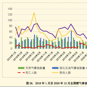值得注意的是,《报告》显示,近36个月燃气事故发生中,每年7、8月份都存在一个事故数量的突起。而2020年事故发生数量较高月份是8月、10月、11月、12月四个月,每月超过60起,事故发生偏低的是1月、2月两个月,每月低于30起。