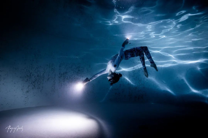 真正有了这个想法后,我才发现西方人在水中自如状态下舞蹈早就有了。2018年,法国潜水员、舞蹈家Julie Gautie在全球最深的的游泳池Y-40 The Deep Joy中,约12层楼深的水下,自导自演了一部难度极高的艺术短片《AMA》,当时就炸全网。那一年,我和几个玩伴也在印度尼西亚的达拉湾海底拍一组舞蹈+武术中国风的视频,在国内潜水圈也火了一把,但没有出圈,说实话潜水运动在国内都谈不到普及,水下舞蹈就更小众了,可能也就几个人在玩,真的屈指可数。