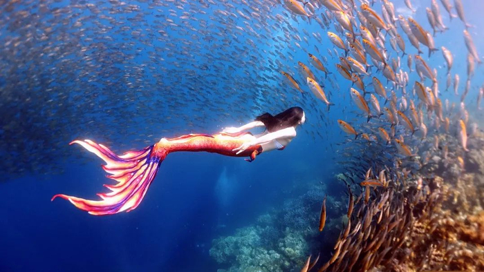 “美人鱼课”就是教喜欢潜水又喜欢美的姑娘们,在水下如何使用"鱼尾",以及恰当的呼吸技巧,去模仿、体验美人鱼游泳的感觉。我本人在花样游泳业余体校呆了十年。看过《出水芙蓉》吗?花样游泳基本是在水面上做舞蹈动作。我是五年前学习了潜水,又有花样游泳的基础,所以突发奇想:在水下跳舞应该是件很特别、很酷的事情。