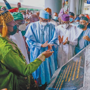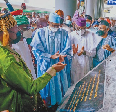 尼日利亚总统布哈里(前排左三)在莫博拉吉·约翰逊火车站出席拉伊铁路通车仪式并揭牌。