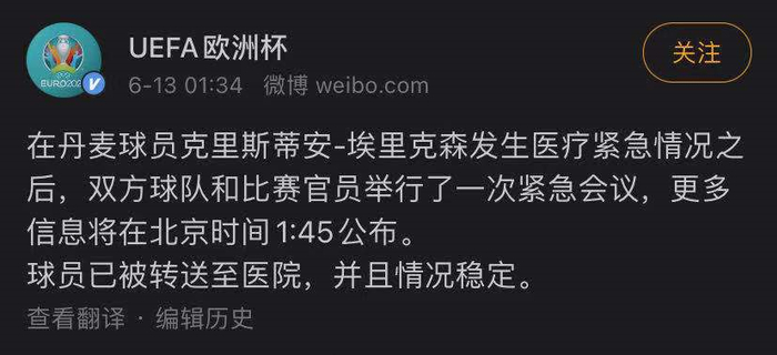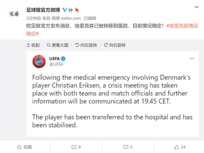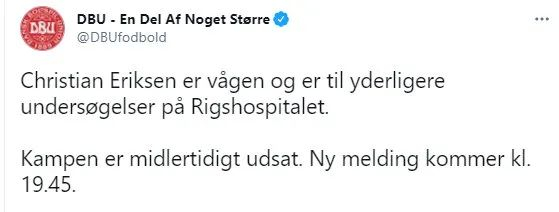 之后,欧足联也发布消息称,埃里克森已经被转移到医院,目前情况稳定。