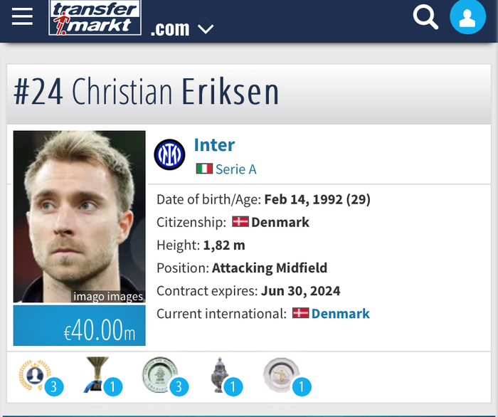 根据德国“转会市场”网站,目前效力意大利国际米兰俱乐部的埃里克森身价达高4000万欧元。