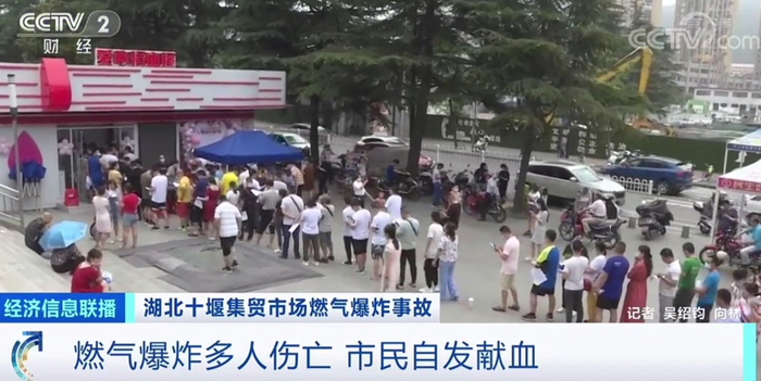 爆炸事故发生后,湖北十堰市民自发报名献血,在一些献血点,献血市民排起了长队。