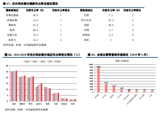沃尔玛于1962年诞生于美国阿肯色州,1972年于纽交所上市,并发展为全球零售霸主。2018年沃尔玛在美国超市行业的市占率为25.9%,并在墨西哥、智利、加拿大、巴西、英国、中国等地区市占率排名前三。截止2019年4月30日,沃尔玛总市值达2996亿美元,在全球主要零售上市公司中位居第二,仅次于亚马逊。