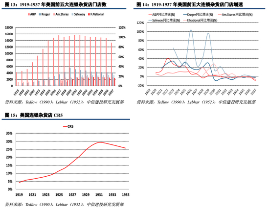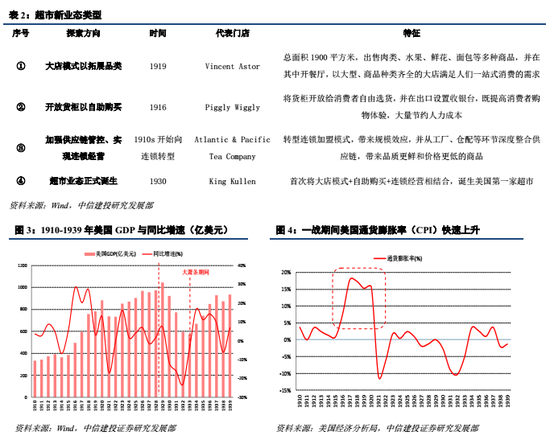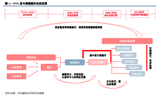 我们深度复盘美国超市行业的发展历程:①模式探索期(1910-1939)。美国经济大萧条,经过四次深度探索后,1930年诞生出了超市。②快速发展期(1940-1979):二战后美国经济黄金发展。伴随着城镇化发展,白人群飞,家电和汽车普及率提高,公路网络配套完善,超市爆发发展。相比于1939年,1977年美国超市的数量增长18倍,销售额增长147倍。③新业态迭代期(1980-2009):美国经济增速换挡,超市增速放缓且整合加快,CR4从17%提升至38%。金融危机时必选消费刚性凸显。④互联网时代新发展(2010至今):美国经济走出次贷危机后复苏,千禧一代成为消费主力,城镇化水平达到80%以上。2010-2018年美国超市销售额CAGR为2.9%,远低于电商行业16.21%的增速,超市CR5仅提升3pct至45%。为应对电商冲击,线下零售转向小业态,专注于最后一公里。