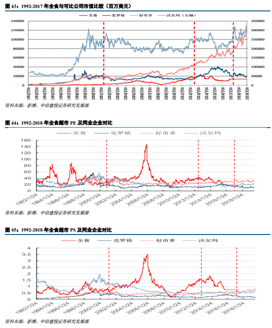 全食发展历程可划分为四大阶段:①精选赛道、外延扩张(FY1978-2001):全食营收/净利润优于同业,CAGR=38/46%,主要得益于有机行业东风,持续外延并购+内生展店。②推动整合,布局海外(FY2002-2012):全食2002年进军加拿大海外扩张,2007年收购最大竞争对手Wild Oats Market,期间受金融危机扰动较大。危机前:美国经济泡沫繁荣,全食营收/净利润CAGR=20/25%,同店约13%。危机中:全食定位中高端受危机冲击明显,叠加收购失利业绩大幅承压,营收/净利润CAGR=10/-13%,同店-3%。危机后:营收/净利润CAGR=14/39%,同店9%,业绩反弹明显。③竞争加剧,电商冲击(FY2013-2017):受有机食品市场竞争加剧与电商冲击影响,全食营收、业绩增速不断下滑,营收/净利润CAGR=6/-11%,同店增速下滑至1.5%。④牵手亚马逊再出发(FY2018至今):FY2017末全食被亚马逊收购,二者在商品品类、供应链、全渠道融合、会员体系打通等方面协同效应巨大,前景值得期待。