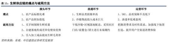经营模式:随着资本涌入和龙头不断创新,生鲜品类的经营模式加速迭代。一是以每日优鲜、叮咚买菜为代表的前置仓模式,前置仓需要资金投入来提高仓的密集度,再加自建配送运维团队的成本高昂;二是接入第三方平台的到家模式,包括外卖平台饿了么和美团以及京东到家和淘鲜达,具有流量和技术优势;三是店仓一体化模式,如盒马、永辉等,供应链和品牌优势强。